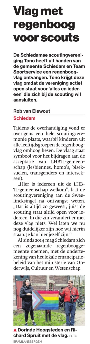 De Schiedamse scoutingvereniging Tono heeft uit handen van de gemeente Schiedam en Team Sportservice een regenboogvlag ontvangen. Tono krijgt deze vlag omdat de vereniging actief open staat voor 'alles en iedereen' die zich bij de scouting wil aansluiten.